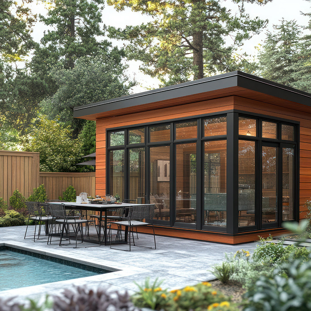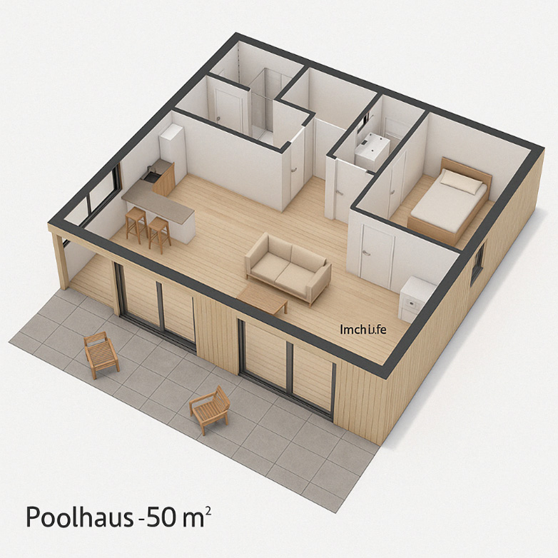 Das Tinyhaus als Poolhaus ist der perfekte Begleiter für Ihren Garten mit Wasserlandschaft. Auf