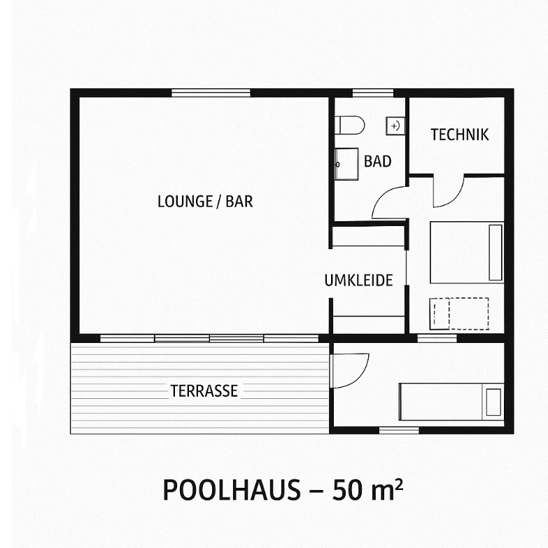 • Ein separater Technikraum nimmt diskret alle Installationen für Pooltechnik oder Hausversorgung auf.